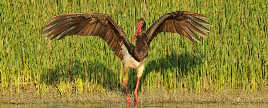 Vogelbescherming NederlandEen zwarte ooievaar die in het veld staat is gemakkelijk te herkennen. Een opvallende, grote, zwarte vogel op hoge poten. Onmiskenbaar. In de lucht is de zwarte ooievaar (zeker van grote afstand) wat lastiger van ‘onze’ witte ooievaar te onderscheiden. Maar wie let op de zwarte hals en geheel zwarte vleugels (de ooievaar heeft zwart-witte vleugels en een witte hals) kan hem ook in de lucht leren herkennen. Een volwassen zwarte ooievaar is een prachtige verschijning met een dieprode snavel en poten. De zwarte bovendelen geven in de zon een groene en paarse gloed. In Nederland zien we op doortrek echter vooral jonge vogels. Die hebben nog geen rode poten en snavel maar grijsgroene en het zwart van de veren is doffer. Misschien minder fraai dan volwassen vogels, maar nog altijd schitterend om te zien.
