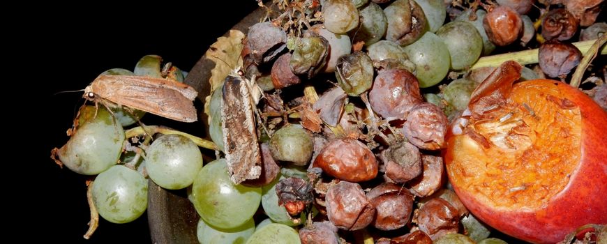 Ook ’s avonds is de schaal in trek. Naast slakken, oorwurmen en andere kleine diertjes zijn er ook nachtvlinders op aan te treffen. Een van de meest talrijke op dit moment is de huismoeder. Deze grote uil is soms wel met vijf of meer op een schaal aanwezig. Met de lange roltong drinken ze het rotte vruchtensap. Huismoeders zijn erg variabel wat kleur betreft. Van vrijwel effen kaneelbruin tot zeer bont gekleurde exemplaren kom je tegen (zie leadfoto). Andere opvallende nachtvlinders op fruit zijn agaatvlinder en roesje. Dit zijn algemene vlinders die in het hele land voorkomen en ook vaak in tuinen te vinden zijn. Bijkomend voordeel van zo’n rotfruitschaal is trouwens dat je daarmee de wespen van je terrastafel met limonade kunt weglokken. Deze zullen zich op en bij de schaal ophouden, zodat wij er minder last van hebben. Verzamel je rotte fruit, en maak zelf ook een rotfruitschaal in je tuin. Je zult versteld staan wat je er op te zien krijgt, zowel overdag als ’s nachts.