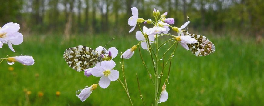 De rupsen van vlinders zijn vaak erg kieskeurig. De meeste rupsen kunnen maar van één of enkele plantensoorten goed leven. Vaak zijn de planten die ze eten van eenzelfde familie. Dat geldt ook voor het oranjetipje, waarvan de rupsen gebonden zijn aan kruisbloemigen. De rupsen kunnen in kweeksituaties overleven op tientallen soorten kruisbloemigen; in de vrije natuur zijn pinksterbloem en look zonder look de belangrijkste waardplanten. Op deze twee soorten is de overleving van de rupsen ook het grootst. Maar ook op tuinplanten zoals judaspenning en damastbloem, die nu bloeien, kunnen eitjes worden afgezet. De rupsen leven niet van het blad, de stengel of de bloem van de plant, maar van de zaden. Bij de judaspenning zijn dat dus de ‘penningen’; hierop zijn de rupsen prima te vinden. Als u over een week of twee à drie de judaspenning goed afzoekt, kunt u zomaar aangevreten penningen vinden en misschien ook wel de rups. Maar ook pinksterbloem en look zonder look kunnen prima groeien in tuinen. Sterker nog: vaak staat de pinksterbloem in het gazon, maar krijgt hij door de wekelijks maaibeurt niet de kans te bloeien.