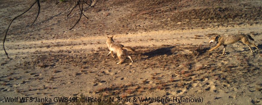 Foto: N. Stier & V. Meißner-Hylanová, TU Dresden (leadfoto: zenderwolf Janka met een roedelgenoot in het ouderlijk territorium in Ueckermünde)