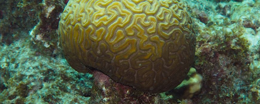 Foto's: Didier de Bakker (leadfoto: hersenkoraal (Diploria labyrinthiformis) dat probeert te overleven bij dominant geworden eroderende factoren op dit aangetaste Caribische rif)