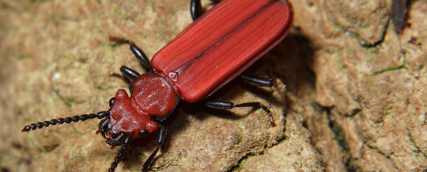 De opvallend gekleurde vermiljoenkever (Cucuius cinnaberinus) werd in 2012 voor het eerst in Nederland aangetroffen. Ondanks zijn rode kleur is deze kever niet makkelijk te vinden. Zowel de larven als de volwassen kevers brengen het grootste deel van hun leven door onder de schors van dode bomen. Natuurgids Bert Vervoort was dan ook blij verrast met de ontdekking, toen hij samen met Jeanne Soetens een excursie van Natuurwerkgroep Liempde in het Dommeldal bij Olland begeleidde: “Hier tussen Liempde en Sint-Oedenrode meandert de Dommel nog prachtig door het landschap. In een populierenbosje versperde een omgevallen dode populier ons wandelpad. De dode boom was aangetast door de honingzwam, want de zwarte myceliumdraden staken uit de schors. Hierdoor was de schors gedeeltelijk losgelaten. Ik trok een stukje schors los en tot onze verbazing zagen we een heleboel leven. Tientallen pissebedden, een stuk of vijf langwerpige larven en een rode kever. Hoewel we hem nog nooit in het echt hadden gezien, zeiden we beiden tegelijk: dit is een vermiljoenkever. Vlug wat googlen op onze telefoon, en we zagen inderdaad dat we gelijk hadden. Snel meteen wat foto’s gemaakt en na wat speurwerk thuis zagen we pas hoe zeldzaam en beschermd de vermiljoenkever is.”