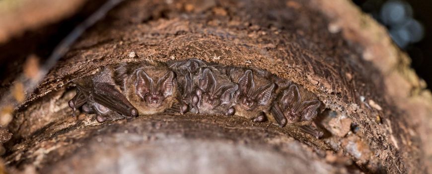 Foto’s: Christian Giese (leadfoto: kraamgroep mopsvleermuizen achter een stuk loszittende boomschors); Joris Verhees; Jens Rydell