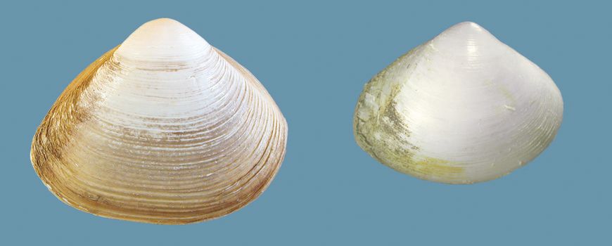 Foto's: R.H. de Bruyne (leadfoto: links de inheemse Halfgeknotte strandschelp, strand van Terschelling); Ton van Haaren (leadfoto: rechts de invasieve Amerikaanse strandschelp, exemplaar uit Noordzeekanaal); Inge van Lente