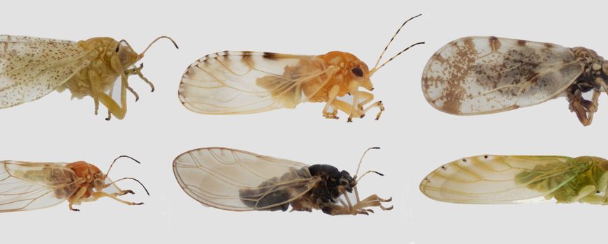 Foto's: Theodoor Heijerman (leadfoto: bladvlooien. Boven: Craspedolepta latior, Cacopsylla crataegi en Aphalara ulicis. Onder: Cacopsylla pulchra, Bactericera reuteri en Spanioneura fonscolombi. Alle nieuw voor Nederland); Érsek László
