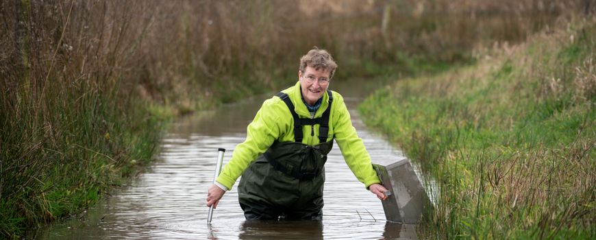 “Kijk, bomen en planten stáán er gewoon. Daar valt altijd wel wat over te vertellen, eventueel met een boek erbij. Maar voor de waterwerkgroep moet je meer moeite doen. Je loopt te sjouwen met vallen en waadpakken – hoewel veel van onze leden het juist leuk vinden dat ze net als vroeger weer ‘de sloot’ in mogen. Je weet van tevoren ook nooit of er iets in zo’n val zit. Gelukkig vinden kinderen een excursie altijd leuk en ze vangen meestal ook zelf wel iets. Soms zijn het beestjes die je dan met een vergrootglas kunt bekijken. Als ze dan een waterschorpioen vinden of een bloedzuiger, zijn ze helemaal opgewonden.”