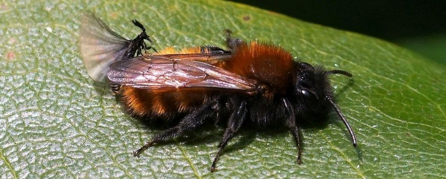 Foto’s: Engelbert Luitsz (leadfoto: man Stylops nevinsoni op achterlijf vosje (Andrena fulva)); Antoine van der Heijden; John Smit.