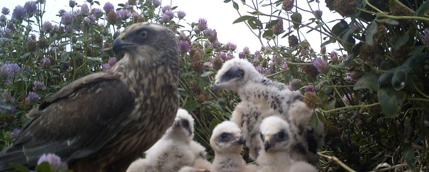 Afgelopen broedseizoen werd er in Oost-Groningen een bijzonder broedgeval van bruine kiekendieven in een veld van rode klaver gedocumenteerd. Toen het nestperceel eind juni gemaaid werd, verliet de vrouw door de verstoring haar nest met drie kleine jongen (één tot vijf dagen oud) en twee eieren. Dit is helaas geen uitzondering op de regel en bruine kiekendieven zijn hier verstoringsgevoeliger in dan grauwe kiekendieven.