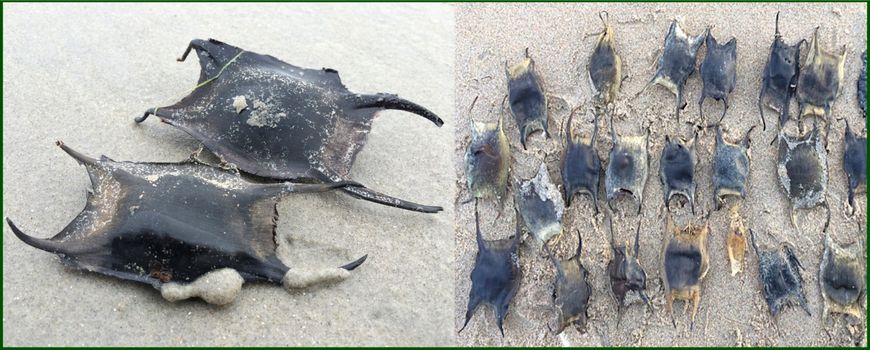 Leadfoto: Eikapsels van de Stekelrog; op de rechterfoto staat ook nog één eikapsel van de Hondshaai (Scyliorhinus canicula) (onderaan, derde van rechts). Bronnen: links Petra de Jong; rechts: Arie Twigt)