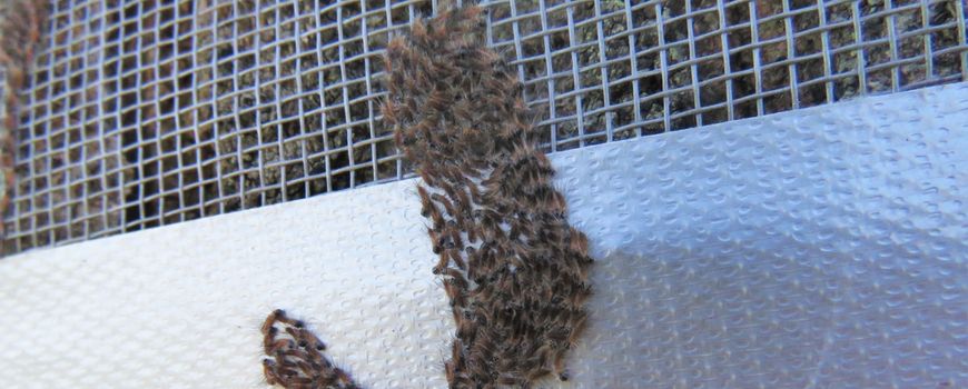 Het aantal rupsen dat achter en rondom het net werd aangetroffen bleek beduidend groter dan je op basis van het aantal eitjes op de stam kon verwachten. Bij nadere inspectie bleek dat de eikenprocessierupsen niet alleen uit de eipakketjes op de stam kwamen, maar ook uit de dode vrouwtjes die kennelijk bevrucht waren. Dat hadden we nog nooit eerder waargenomen.