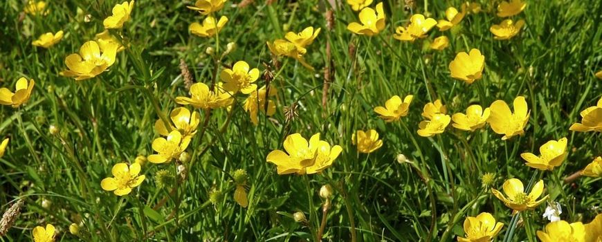 De bloemen van verschillende boterbloemen staan in bloei. Er komen in Nederland meer dan tien soorten boterbloemen voor. De bloemen die je het meest ziet, zijn die van de scherpe boterbloem en de kruipende boterbloem. Deze botergele bloemen staan meestal aan de randen van velden en sloten. Door intensivering van de landbouw is het grondwater verlaagd en wordt er veel kunstmest uitgereden. Op velden waar dit gebeurt maken snel groeiende grassen nu de dienst uit. Boterbloemen zijn hier nog wel langs de randen zichtbaar.