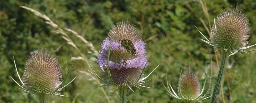 Langs rivieren en dijken staan de bollen van de grote kaardenbol in bloei. Deze prikkende plant houdt mensen op afstand met een groot arsenaal aan stekels. Maar wanneer je langs deze verdediging kijkt, heeft ze een prachtige bloeiwijze. De bloemetjes in het midden bloeien als eerste en langzaam verschuiven deze ringen van bloemen zich naar boven en naar beneden. Insecten zijn er gek op en hebben weinig last van de stekels.