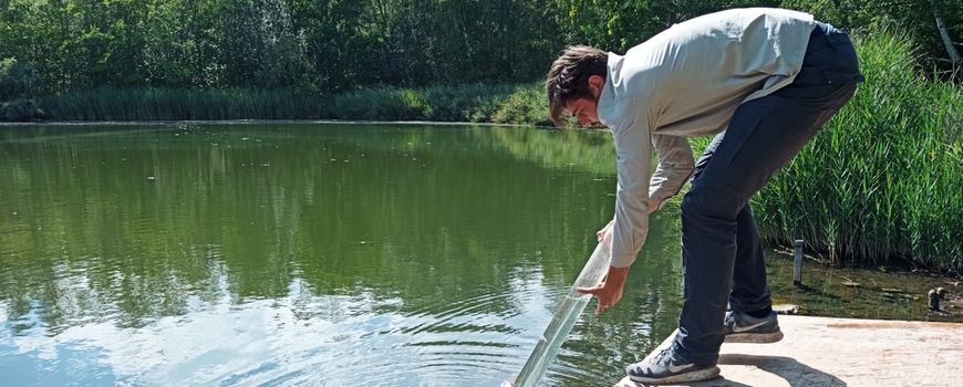 Nederlands Instituut voor Ecologie (NIOO-KNAW)Met een koele plons verdwijnt de doorzichtige buis in het water. Onder water klapt hij dicht. Deze ‘waterhapper’ gebruiken de wateronderzoekers om een watermonster uit de plas te nemen. Dit keer staan ze bij een vijver in een Eindhovens park. Vorige keer was het een singel in Rotterdam, een vijver in Swifterband of het plaatselijke water van Stadskanaal.