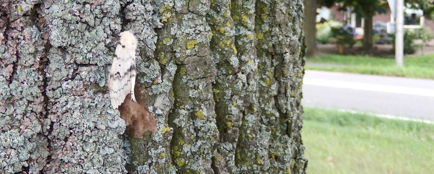 Via facebook en Twitter, maar ook via de vraagbaak van Vlindernet en via e-mail en telefoon worden ze gemeld. Vaak met opmerkingen als: “Deze zit nu al een paar uur stil op mijn boom en hij doet niets.” Dat laatste klopt dubbel niet. In de eerste plaats gaat het meestal om een zij, een vrouwtje. En in de tweede plaats zit ze zeker niet stil, maar is ze druk aan het werk, al zien we dat niet een-twee-drie. De eitjes van de plakker worden in pakketjes bij elkaar afgezet tussen schorsspleten van loofbomen. De eieren worden afgedekt met haren van het achterlijf van het vrouwtje. De eitjes overwinteren in dat spinsel en komen in het voorjaar, van april tot juni, uit. Soms laat de jonge rups zich door middel van spindraden met de wind meevoeren en kan zich zo kilometers verspreiden. De rups verpopt zich in een spinsel tegen de schors, tussen de bladeren of in de strooisellaag. het is een hele algemene nachtvlinder die in augustus als vlinder veel wordt gemeld.