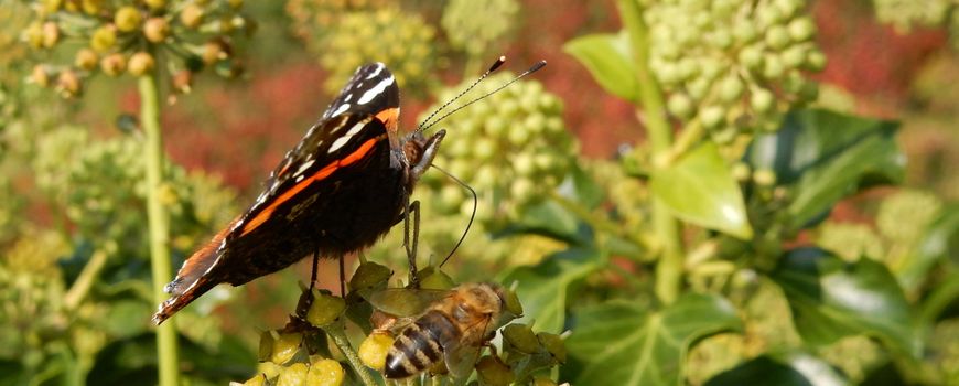 Als het zonnig is kun je bloeiende klimop met je ogen dicht vinden door het gezoem van allerlei insecten die er op en bij zitten. Als je dan je ogen open doet, zie je ook de vlinders die zich tegoed doen aan de nectar. Soms zie je wel tien of nog meer atalanta’s bij elkaar op een mooie klimopwand. Ook dagpauwoog, gehakkelde aurelia en kleine vos kun je erop tegenkomen. Dit zijn vlinders die nog gaan overwinteren en hoe meer die voor de winter nog kunnen eten, hoe groter de kans dat ze deze overleven. Nachtvlinders weten de klimop ook te vinden en af en toe met je zaklamp controleren levert soms leuke soorten op als agaatvlinder, zwartvlekwinteruil en andere motten. Ook voor veel andere insecten is klimop enorm belangrijk, juist omdat er verder niet veel meer bloeit. De klimopbij is zelfs helemaal afhankelijk van klimop, want die is er helemaal op gespecialiseerd. Deze zeldzame bij neemt de laatste jaren toe, waarschijnlijk door klimaatverandering. Voor vogels is klimop een belangrijke schuilplaats en de bessen die eraan komen zijn voedsel.
