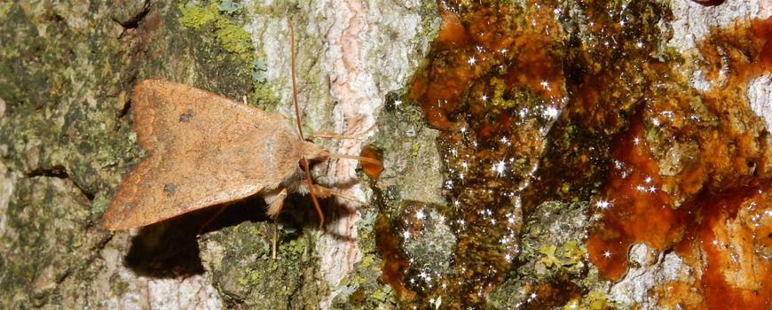Voor de dagvlinders is het seizoen zo’n beetje over. Er zijn zeker nog wel vlinders als kleine vuurvlinder, icarusblauwtje en oranje luzernevlinder en ook de vlinderoverwinteraars als dagpauwoog en kleine vos komen nog wel eens tevoorschijn om nog even op zoek te gaan naar nectar, maar nieuwe soorten verschijnen er niet meer. Bij nachtvlinders is dat anders. In september en oktober zijn er heel wat soorten voor het eerst te zien. Een hele goede manier om die te zien te krijgen is door te stropen of smeren. Dat houdt in dat je een zoete, flink geurende stof op bomen smeert. Dat gaat om plekjes van vijf bij tien centimeter. De geur verspreidt zich en vanuit de omgeving worden nachtvlinders naar die plek gelokt. Stropen kun je het hele jaar door doen, maar het is vooral effectief als er verder niet veel te halen is. Als er veel bloeiende planten zijn, zoals in voorjaar en voorzomer, dan zie je niet veel vlinders op je stroop, maar nu, in het najaar is dat een erg succesvolle activiteit.