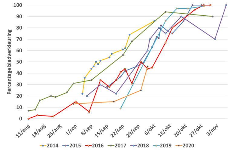 De Natuurkalender, GLOBE Nederland, Wageningen University2020 voert samen met 2014 en 2007 de lijst aan van warmste jaren sinds 1901. September was met een gemiddelde van 15,1°C in De Bilt volgens het KNMI een warme maand en augustus met 20,4°C zelfs een zeer warme maand. In combinatie met het ontbreken van nachtvorst zorgt dat voor het traag op gang komen van de bladverkleuring. Het is natuurlijk niet zo dat er nog helemaal geen bladeren verkleuren. Het is al 4 oktober en de dagen worden al flink korter. Hierdoor maken de bomen minder van het groene chlorofyl aan. Adere kleurstoffen in de bladeren krijgen daardoor de kans om zichtbaar te worden. Door de hoge temperaturen ligt de productie van het plantenhormoon auxine hoger dan normaal, wat er voor zorgt dat het kurklaagje tussen het blad en de tak minder snel gevormd wordt. Dit vertraagt ook de bladverkleuring en bladval.