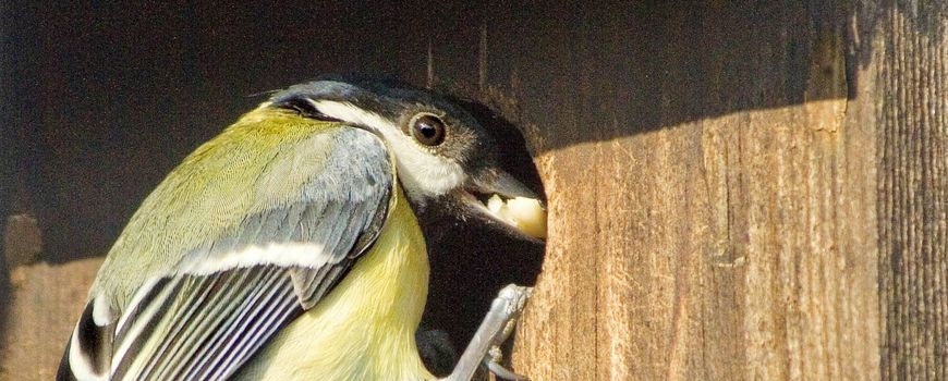 Vogelbescherming NederlandOosterbegraafplaats in Amsterdam. Een koolmeesvrouwtje dat met voer landde voor de invliegopening van een nestkast. Vanuit de nestkast hoorde ik het gepiep van de bedelende jongen. Ik bezoek de begraafplaats regelmatig en het was me al opgevallen dat er nog steeds koolmeeszang klonk. Daar had ik weinig aandacht aan besteed. Koolmezen maken eigenlijk altijd wel geluid. Nu viel het op z’n plek, er was hier nog een territorium met een nest! Ik stopte om te kijken. Prompt kwam het mannetje aanvliegen en liet de alarmroep horen. Het vrouwtje verdween in de nestkast, waar de jongen nog harder begonnen te piepen.