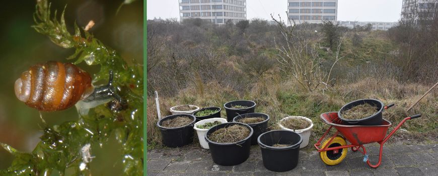 Foto’s: A.W. Gmelig Meyling & Arno Boesveld, Stichting ANEMOON (leadfoto: links: Nauwe korfslak (Bron: A.W. Gmelig Meyling); rechts: kruiwagens met strooisel waarin de populatie Nauwe korfslakken zich bevindt om te worden overgebracht naar de adoptielocatie (Bron: A. Boesveld)