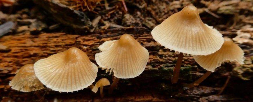 Er zijn meer dan 150 soorten mycena’s bekend in Nederland. Sommige kan je onderscheiden aan de kleur of de lengte van de steel, een aantal aan de geur. Voor de meeste soorten is dat veel moeilijker. De helmmycena kan iedereen daarentegen wel herkennen vanwege de vorm van het hoedje. Deze soort heet niet voor niets zo, want de hoed lijkt een beetje op een ouderwetse tropenhelm. Hij komt algemeen voor op dood hout van loofbomen, vaak in groepjes. Als je twijfelt, kijk dan nog even onder de hoed, dan vind je kleine dwarsschotjes tussen de lamellen. Loepje mee dus.