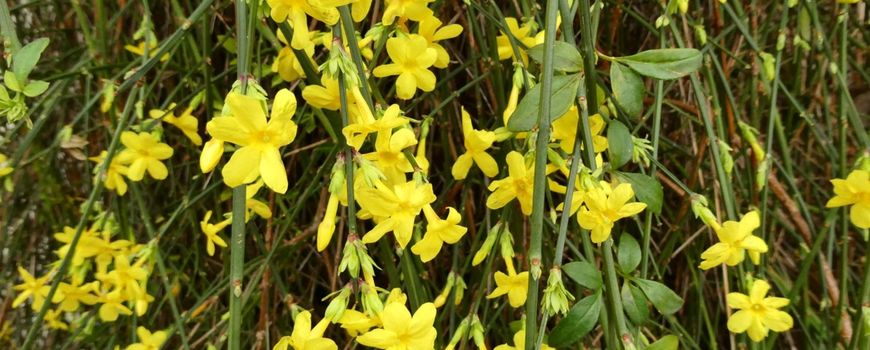 Er zijn nogal wat planten die in de winter en het voorjaar bloeien. Winterjasmijn is er daar één van. Deze plant kan goed tegen de kou en bloeit nu al in de late herfst. Winterjasmijn lijkt volgens sommigen een beetje op de forsythia, maar is toch echt anders. De soort komt van oorsprong uit China en doet het hier goed. Hij wordt vaak aangeplant tegen gevels waar de planten opgebonden moeten worden, want zelf klimmen kunnen ze niet. Pas na de bloei komen de blaadjes. De helder gele bloempjes geven een aangename lichte geur af. Ruik er eens aan als je de winterjasmijn tegenkomt!