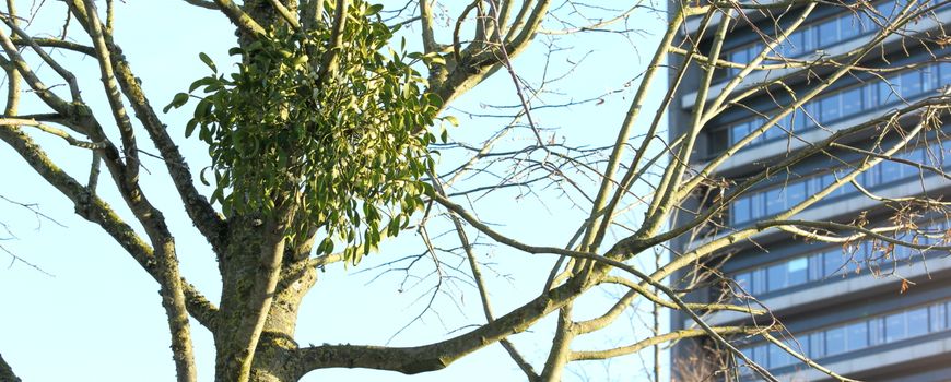Provincie Noord-Brabant“We zagen hem twee jaar geleden, toen de bladeren van de bomen waren. Opeens bleek een maretak in de lindeboom te groeien. Heel bijzonder, want maretak houdt veel meer van populier of appelboom,” zegt Fiona Franken, ecoloog bij de provincie Noord-Brabant. Op het voorplein voor het Provinciehuis aan de Brabantlaan in ’s-Hertogenbosch, werden ruim twee jaar geleden nieuwe bomen aangeplant. In de herfst bleek er een verstekeling meegekomen: de maretak in de linde.