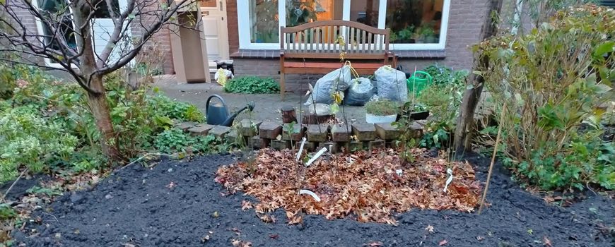 En eindelijk is het zover. Op 12 november levert een bezorger mijn pakket af. In de handleiding lees ik dat het zo snel mogelijk de grond in moet. Dat wordt nog een uitdaging. Het is buiten al donker, te donker om een tuiny forest te planten. Maar de volgende dag moet ik werken, dus dat wordt ook lastig. Je moet iets voor een tuiny forest over hebben. Dus voor dag en dauw zet ik mijn wekker en wacht ik op het eerste daglicht. De meeste tijd ben ik kwijt aan het spitten van een plantgat. Wel een dankbare taak, want daarna gaat het planten vrij eenvoudig. Plant erin, grond weer aanvullen en klaar! De bomen en struiken dek ik vervolgens af met bladeren die ik de afgelopen weken speciaal voor dit doel verzamelde. Als het planten klaar is, kan er worden gezaaid. Daar zal ik voorlopig nog weinig van gaan zien, tenzij het zo warm blijft als de afgelopen tijd. In een uur is de klus geklaard en kan ik aan het werk. En nu wachten maar…