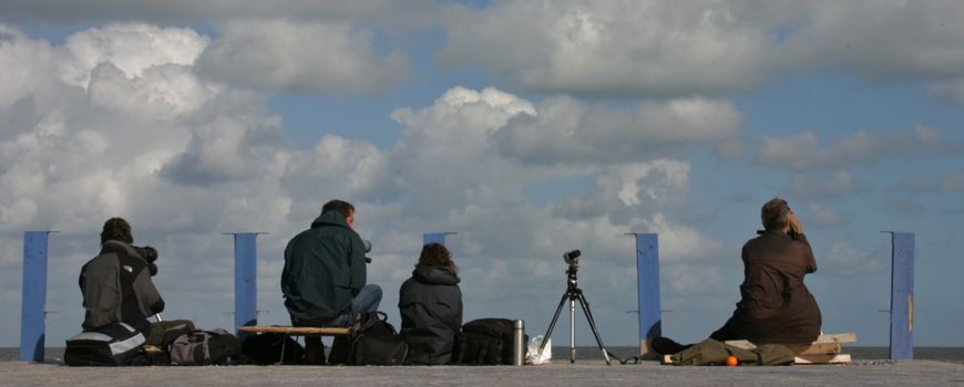 Foto's: Harvey van Diek (leadfoto: zeetrektellers kijken over zee op Schiermonnikoog); Peter Soer