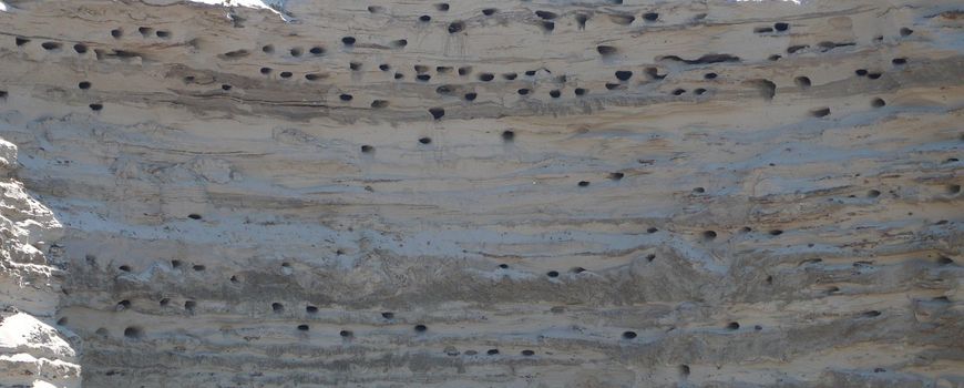 Nature TodayDe oeverzwaluwen keren nu massaal terug uit Afrika. Ze zijn meteen begonnen met het graven van hun nesten. Dat doen ze meestal in steile oevers langs rivieren, of gewoon ergens anders waar een steile zandhoop ligt. Het is wel belangrijk dat er wat leem of klei in zit, anders storten de gangen in. Een nestgat kan wel meer dan een meter diep zijn. Daarachter zit dan nog de nestholte. Veel gangen betekent veel gaten in de wanden. Je kunt een zwerm oeverzwaluwen er al kwetterend voor zien vliegen. Hoe ze toch altijd hun eigen nestgat weten te vinden? Bij rivieren kan het soms rampzalig aflopen. Als het water onverhoopt toch een keer sterk stijgt, worden de wanden, soms met nesten en al, weggespoeld. Dan moeten ze opnieuw beginnen. Hopelijk gebeurt dat dit jaar niet.