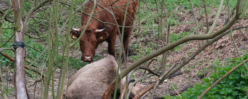 De Slikken van de Heen bestaan uit voormalige zandplaten, slikken en schorren, die inmiddels begroeid zijn met bloemrijk grasland en open bos. De variatie in het gebied wordt bevorderd door begrazing met konikpaarden, rode geuzen en wisenten. Dit voorjaar bleek een wisentkoe niet meer bij de kudde te lopen. Na het nodige zoekwerk werd ze gevonden met een gescheurde pees. Bezoek van een dierenarts en een behandeling mochten helaas niet baten, waarna ze uit haar lijden is verlost. Omdat wisenten wilde grazers zijn, mogen ze net als reeën en hazen in de natuur blijven liggen als ze sterven. Voor de natuur een belangrijke aanwinst!
