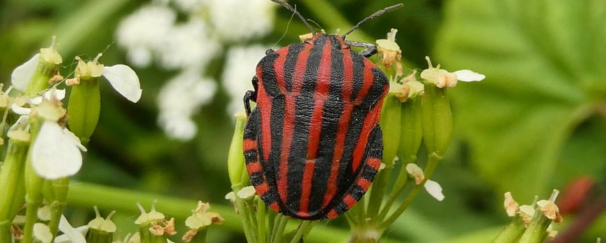 Nature TodayWantsen zijn een heel speciale groep dieren in de insectenwereld. In Nederland komen meer dan zeshonderd soorten voor. Het zijn allemaal insecten die hun voedsel naar binnen zuigen, of het nu uit een plant of uit een ander dier komt. Wantsen kunnen in allerlei biotopen voorkomen, zowel boven, onder als zelfs óp het water. Alle wantsen hebben weer andere vormen en kleuren. Wat ze bijna allemaal wél gemeen hebben is een klein of groot driehoekig halsschild dat naar achteren wijst. De wants op de foto is makkelijk herkenbaar, het is namelijk de enige die zich op deze manier heeft aangekleed: donkerrood met zwarte strepen. Bovenin veel soorten bloemen kan je deze wants nu vinden. Hij heet pyjamawants.