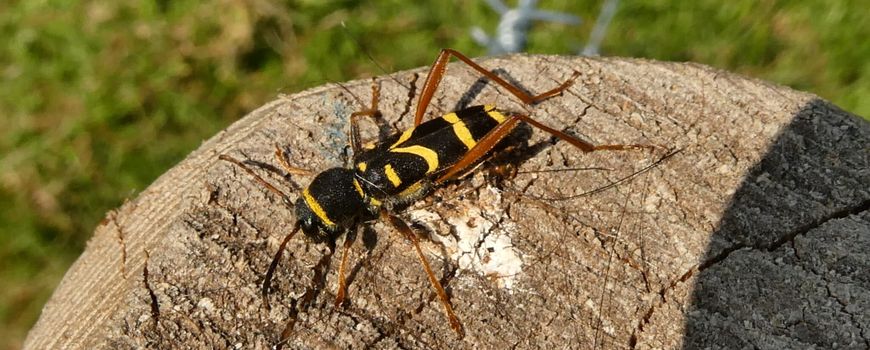 Nature TodayDe kleine wespenboktor, of kleine wespenbok, is een soort boktor. Dat kan je zien aan het lange lijf en de lange voelsprieten die boktorren meestal hebben. Deze wespenboktor heet niet voor niets zo. Het is een onschuldig diertje dat voornamelijk van stuifmeel leeft. Om zich te beschermen tegen vijanden heeft hij zich vermomd als wesp, met gele strepen over het zwarte lijf. Dat heet mimicry: je voordoen als een ander die gevaarlijker is dan jij. Steken kan hij wel. Kleine wespenboktorren zijn ongeveer anderhalf tot twee centimeter lang en zeer algemeen op oud hout, boomschors, en dergelijke. Daar eten de larven van. De volwassen dieren leven van stuifmeel.