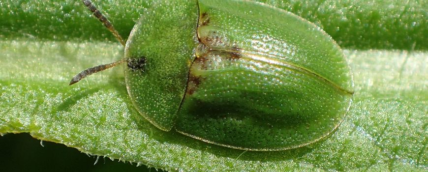 Nature TodayEen echte toevalstreffer, de groene schildpadkever of groene distelschildpadtor. Het is een keversoort uit de familie van de bladhaantjes. Het diertje is nog geen centimeter groot. Ze zijn onder andere te vinden op de bladeren van verschillende soorten distels, knoopkruid en bijvoorbeeld de grote klit. Het hele lichaam wordt bedekt door een drietal schilden. De kop is nauwelijks te zien, alleen twee kleine antennes zijn zichtbaar. Bij gevaar trekt hij als een schildpad alle antennes, de kop en de pootjes in. Hij drukt zich plat tegen een blad en vind hem dan maar weer eens!