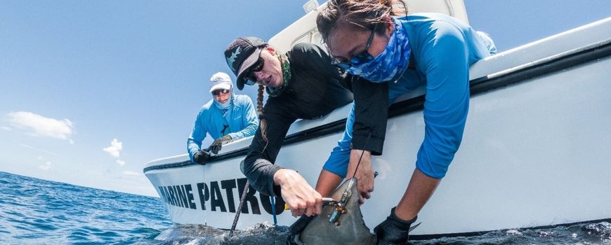 Een aantal ‘high fives’ later ligt de lijn met aas weer in het water en varen we snel door naar lijn nummer 3. Een tijgerhaai! Het is een mooi exemplaar, dus hetzelfde ritueel als zojuist volgt, maar wederom geen satellietzender omdat ze te klein is om volwassen en dus ook zwanger te zijn.