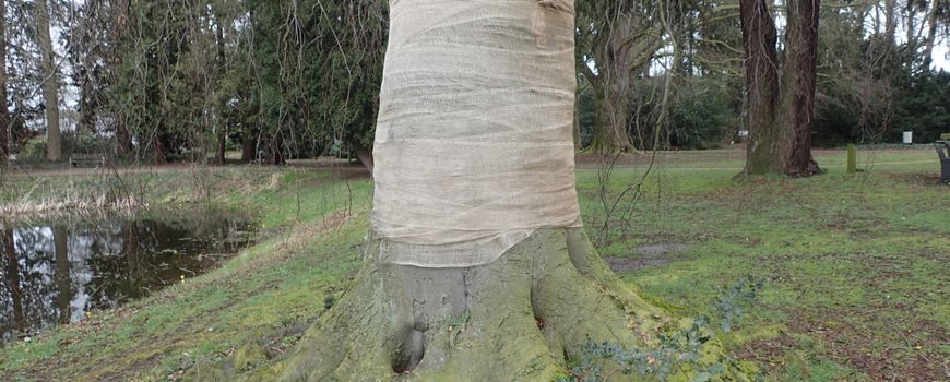 Nature TodayBeuken zijn bomen met een dunne bast. Directe blootstelling aan de zon kan zonnebrand veroorzaken, in feite net zoals bij mensen. Er ontstaan blaren, de schors valt af en dat kan het einde van de boom zijn. De boom beschermt zichzelf tegen de zon door zijn dicht bebladerde takken bijna horizontaal uit te strekken. Daardoor kan er bijna geen zonlicht door en blijft de bast en dus de boom gespaard. Hierdoor zie je in een beukenbos ook bijna geen ondergroei. Maar als er nu een buurman wegvalt, of er breekt een grote tak af, dan wordt de bast ineens blootgesteld aan fel zonlicht. Dan zal de boomverzorger de boom een juten pyjama aantrekken. Het is stevig spul en blijft jaren zitten. Het staat wat raar, maar heeft dus een beschermende functie.