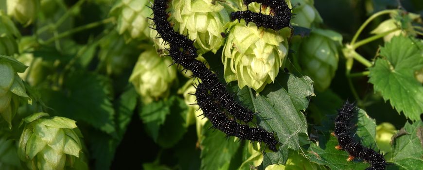 Rupsen van de dagpauwoog op hop (Bron: Sandra Harthoorn)