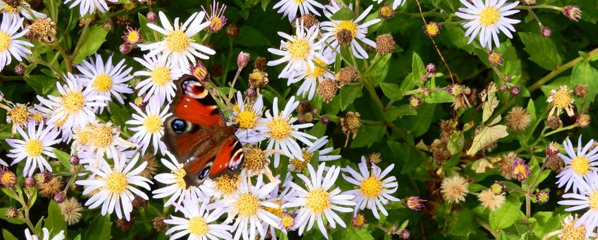 In sommige jaren planten de zomervlinders zich weer voort en is er een tweede generatie in september. Ook in 2020 en dit jaar was dit het geval. Dit jaar is deze tweede generatie erg groot en de dagpauwoog is nu dan ook zeer talrijk. Ze worden vooral veel gezien op plekken waar bloeiende planten staan. Zo laat in het jaar gaat dat bijvoorbeeld om klimop, herfstaster en ijzerhard. De nu actieve vlinders gaan op zoek naar een plek om te overwinteren. De bovenzijde van de vlinder is zeer fel gekleurd, met opvallende ogen. De onderzijde is juist donkerbruin met weinig contrast, zodat ze niet opvallen op de donkere, koele plekken die ze opzoeken. Worden ze toch verstoord, dan klapperen ze met hun vleugels waardoor de felle bovenzijde te zien is. Ze hopen daarmee eventuele vijanden af te schrikken. Ook kunnen ze een geluid maken met hun vleugels, dat nog angstaanjagender zou zijn. Het is een sissend geluid en als je een dagpauwoog in overwintering stoort kun je het horen. Op onderstaand filmpje kun je dit zien en horen (geluid aan!).
