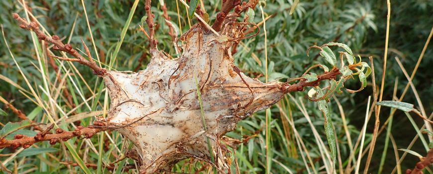 Nature TodayJe hebt vast wel eens de door spinselmotten ingepakte bomen en struiken gezien, meestal in juni. Die nesten verdwijnen snel als de rupsen er eenmaal uit zijn. Op dit moment kan je wel de spinselnesten vinden van de bastaardsatijnvlinder. Deze zitten onder andere veel in duindoorn, een van hun waardplanten. Dat betekent dat je naar de kust moet om ze te zien. De rupsen (blauwachtig, behaard en met twee oranje punten achter het kopgedeelte) zitten voor de winter goed verstopt in hun dichte spinselnesten, ook winternesten genoemd. De brandharen kunnen irritaties geven, dus laat ze maar zitten. De vlinder zelf (een geheel witte mot met een bruinoranje pluimstaart) komt pas volgend jaar weer tevoorschijn.