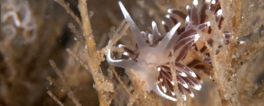 Nature TodayVoor exotisch onderwaterleven hoef je echt niet naar het buitenland. In de Noordzee, maar ook in onze eigen Oosterschelde, komen tal van bontgekleurde zeenaaktslakken voor. Deze verschijnen, net als bijvoorbeeld vlinders, in bepaalde maanden. Dan leggen ze eieren en sterven ze weer. Op dit moment is de zilverblauwe knotsslak te vinden in de Oosterschelde. Deze bonte slak verdedigt zich op een bijzondere manier tegen roofdieren. Het enige dat hij eet is één soort hydropoliep, de zeecypres, die ook op de foto staat. Deze poliep komt uit de familie van de neteldieren, net als bijvoorbeeld kwallen. De zeecypres kan dan ook steken. De zilverblauwe knotsslak slaat de cellen waarmee de poliep steekt op in de uitstulpingen op zijn lichaam. Zo vormen zich de witte puntjes, die je goed kunt zien. Hiermee laat de zilverblauwe knotsslak aan roofdieren weten dat hij giftig is, en dat ze gestoken zullen worden als ze hem proberen op te eten.