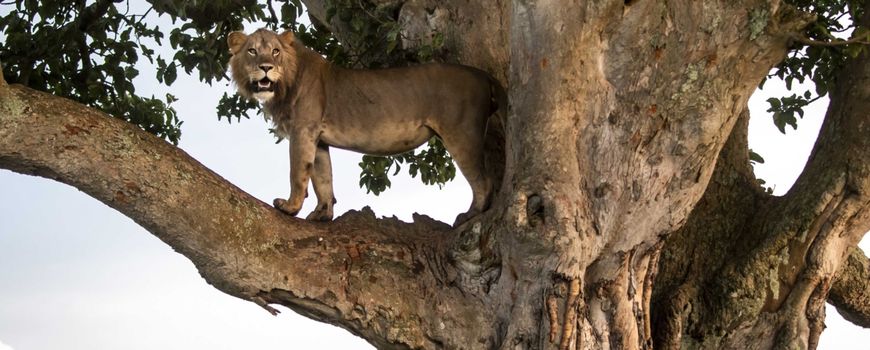 Leeuwen in de rest van Afrika kunnen over het algemeen wel klimmen, maar het ziet er nogal onhandig uit en ze doen het alleen in geval van nood. De leeuwen in de Ishasha-sector, in het zuidelijke deel van Queen Elizabeth National Park in Oeganda – door de lokale bevolking kortweg 'Queen' genoemd – leren het al op jonge leeftijd. Ze doen hun ouders na en zijn al snel uitstekende klimmers. Maar waarom doen de leeuwen hier dit wel en in andere delen van Afrika niet? Waarschijnlijk vanwege de combinatie van drie omgevingsfactoren: het hete en vochtige klimaat (in de bomen is het iets koeler), de irritante tseetseevliegen bij de grond (die ze op deze manier vermijden) en tot slot de vijgenbomen zelf waar ze relatief gemakkelijk in kunnen klimmen en die bovendien een goed zicht bieden op mogelijke prooien onder hen, zoals grazende antilopen.
