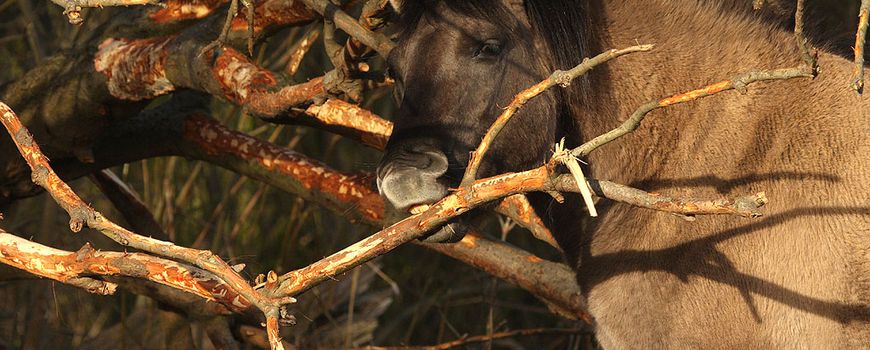 Behalve als er grote grazers rondlopen. Die zijn er als de kippen bij wanneer een boom omwaait of takken verliest. Zoals een hulst alleen stekels aan de blaadjes onderin de struik heeft, zo hebben blaadjes, twijgen en bast ook alleen onderin de boom antivraatstoffen om de grazers weg te houden. Bovendien is de bast bovenin dunner en daardoor eetbaarder. Normaal gesproken kunnen de dieren daar niet bij, maar na een storm ligt plots alles binnen handbereik. De wisenten, wildlevende konikpaarden en Rode Geus-runderen op de Slikken van de Heen sloegen deze week dan ook meteen hun slag en stripten de vers gevallen wilgen van bast en twijgen.