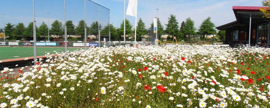 Peter vertelt dat het tien jaar oude kunstgras op Sportpark Oscar Carré inmiddels vervangen is door het milieuvriendelijkere non-infill kunstgras (zonder ‘infill’ van bijvoorbeeld plastics of kurk). "Sinds vorig jaar (2021) maken we bij elke renovatie zelf ook budget vrij voor biodiversiteit. Een stadsecoloog maakt vervolgens een plan dat bij de omgeving past. Hierbij worden overlevingskansen voor doelsoorten vergroot en ontstaat ook meer ruimte voor nieuwe soorten. Met de subsidie van de provincie kunnen we nóg meer doen aan biodiversiteit langs de velden en bij het clubhuis. We realiseren bijvoorbeeld bloemenweides, bosschages, gevelbegroeiing en we planten solitaire bomen en boomgroepen."
