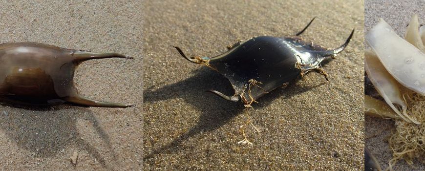 In de vloedlijn kunnen ook eieren liggen van roggen, zoals van de Stekelrog en de Gevlekte rog. Dat zijn rechthoekige dozen: zwart, bruin, rood- of groenbruin, met aan elk van de vier hoekpunten dunne 'hoorns'. Het jonge visje - één per eicapsule - is meestal al geboren. Behalve eikapsels van meerdere roggensoorten, spoelen ook de eieren van de Hondshaai aan. Eveneens rechthoekig, maar goudbruin of geel met aan de hoekpunten lange gekrulde slierten. Soms met meerdere bij elkaar. In het Engels worden ze poëtisch 'het tasje van een zeemeermin' (Mermaid's Purse) genoemd.