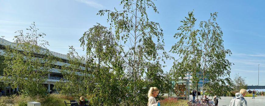 "De verduurzaming van het terrein zie je echter overal. We hebben meer dan honderd bomen aangeplant. De sortimentskeuze op het voorplein refereert direct aan het Brabantse zandlandschap met de Betula pendula en Pinus sylvestris. Dit in tegenstelling tot de boulevard, waar juist soorten zijn toegepast die refereren aan design en innovatie, zoals de Sorbus en Juglans. Een speciaal voor Eindhoven Airport ontworpen bijenhotel van staal en eikenhout biedt een belangrijke kraamkamer voor wilde bijen in de omgeving. Op het voorplein zijn twee overkappingen gerealiseerd met daarop geïntegreerde zonnepanelen voor nog meer duurzame opwekking van energie", somt Broeders op.