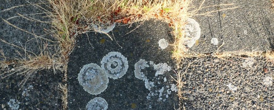 Tijdens de afgelopen warme weken waren er veel verdroogde stoepplanten - hun zaadjes hebben ze al uitgestrooid. Maar we zagen ook de nodige planten die er prachtig fris bij stonden, temidden van dor gras of hete bestrating. De scherp getekende schaduwen lijken haast kunstwerkjes. Op die tegels zijn meer kunstige levensvormen te zien. Ronde plakken in geel, grijs en blauw. Als je niet goed kijkt, zie je ze voor platgetrapte kauwgum aan. Maar het zijn korstmossen. Ook op paaltjes en bomen vind je ze, vaak in het gezelschap van plukjes mos.