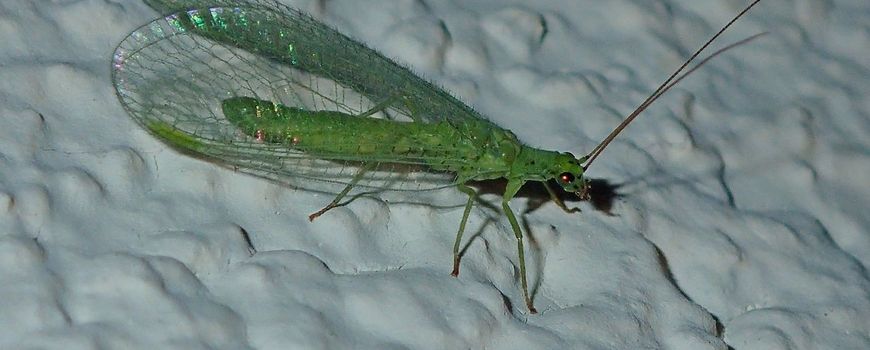Nature TodayGaasvliegen zijn eigenlijk geen vliegen, maar behoren tot de netvleugeligen. En dat is te zien: je kan door de vleugels heen kijken. Het zijn tere beestjes. Ze worden ongeveer anderhalve centimeter lang en zijn groen. Het zijn nuttige dieren, want de larven eten graag bladluizen, die zuigen ze leeg. Daarom worden ze veel in kassen gebruikt als biologische bestrijder van bladluizen. De volwassen gaasvliegen eten ook wel eens bladluizen, maar vooral stuifmeel en nectar. Er zijn meerdere soorten gaasvliegen. Nu vliegen ’s avonds onder andere de groene gaasvliegen, ook goudoogjes genoemd. Als je er eens eentje treft, let dan eens op de ‘gouden ogen’, heel bijzonder.