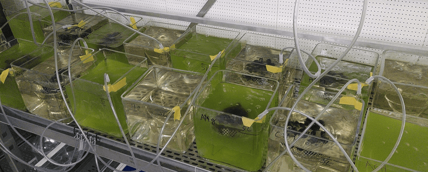 Foto: Charlie Davey (proefopstelling met algen-consumerende mosselen)