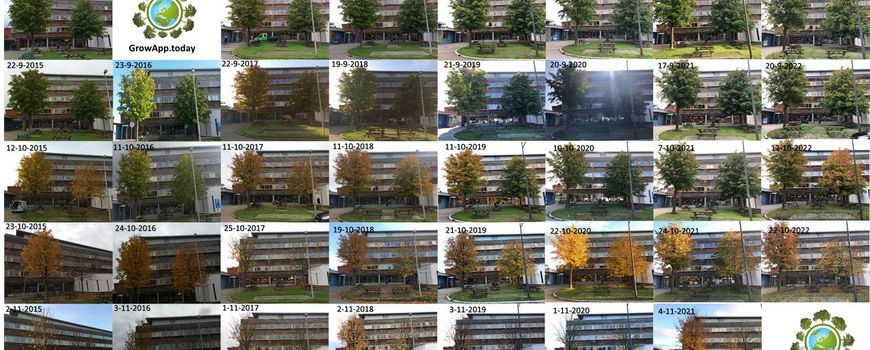 De herfstkleuring verloopt over het algemeen normaal dit jaar in vergelijking met voorgaande jaren, al zit er wel verschil tussen verschillende boomsoorten. Het verloop van de herfstkleuring lijkt wel iets later dan een gemiddeld jaar zoals vijftig jaar geleden normaal was. Dat blijkt uit langjarige herfstwaarnemingen die in het kader van De Natuurkalender zijn gedaan. Verder hebben we diverse GrowApp timelapse-video’s geanalyseerd. Op diverse plaatsen in het land maken vrijwilligers en scholieren in het kader van het GLOBE programma al enkele jaren regelmatig met de GrowApp een foto van een boom, tuin of straat. Het geeft ons mooi inzicht of jaren van elkaar verschillen, en hoe ze verschillen. Hieronder presenteer ik diverse voorbeelden.