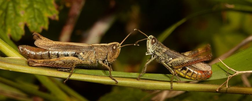 Foto's: Roy Kleukers (leadfoto: zingend mannetje van de Rosse sprinkhaan Gomphocerippus rufus naast een vrouwtje); Xeno-canto