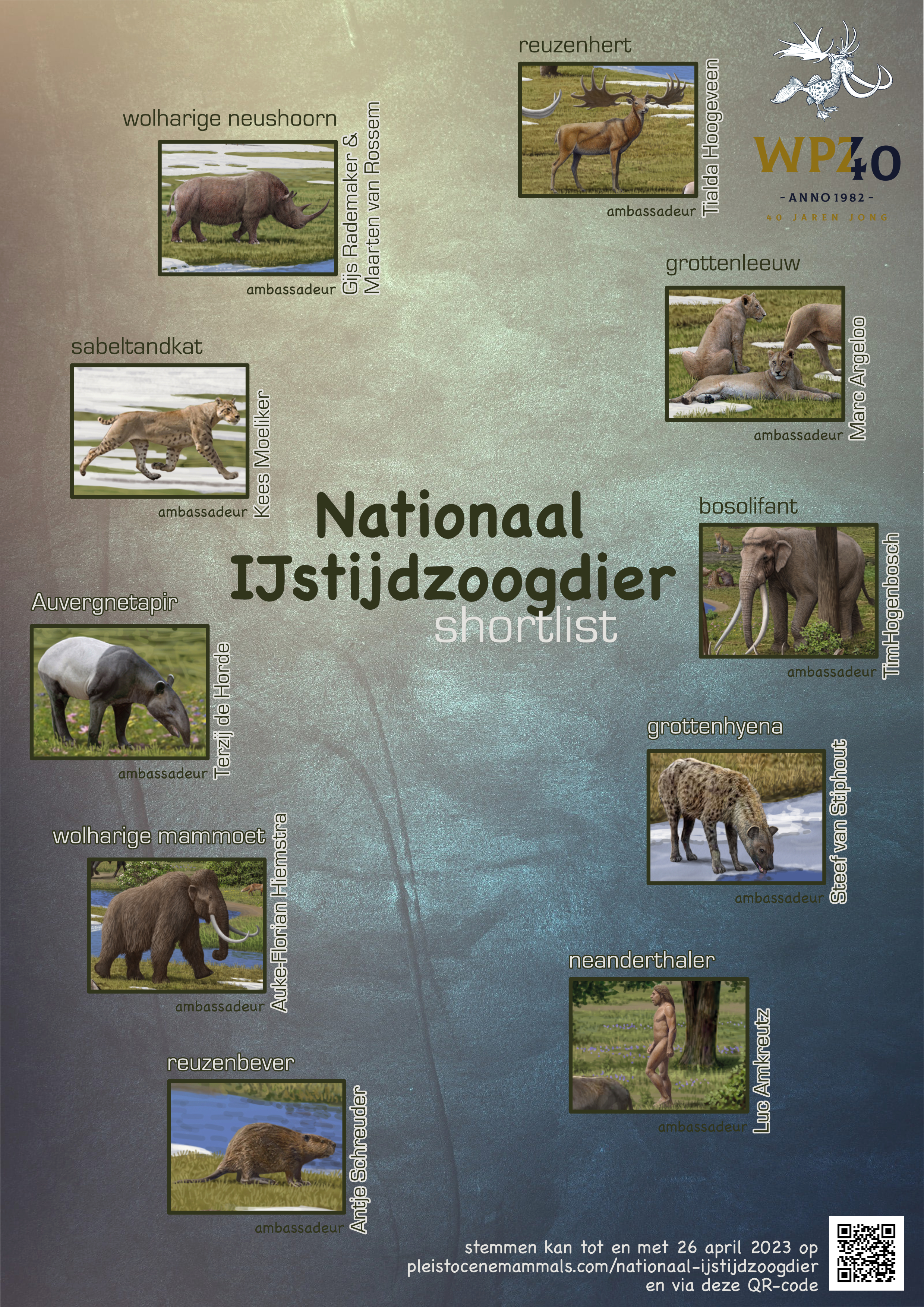 Met het 40-jarig bestaan van de vereniging wilde de WPZ wel eens inzichtelijk hebben welke zoogdiersoorten er in ons land leefden tijdens de zogenaamde IJstijd, de periode tussen 2,5 miljoen en 11.000 jaar geleden (ook wel het Pleistoceen genoemd). Een inventarisatie door leden van de vereniging leverde tenminste 182 verschillende soorten op, maar er waren er vast meer waarvan we de fossielen nog niet gevonden hebben. Om de ijstijdzoogdieren beter te leren kennen heeft de WPZ een digitale safari door de IJstijd ontworpen. De internationaal gerenommeerde paleokunstenaar Mauricio Antón schilderde hiervoor de wetenschappelijk correcte reconstructies van flora en fauna. Op een speciale webpagina met ultrahoge resolutie kun je tot in detail inzoomen op de mega- en minifauna die Nederland in het Pleistoceen bevolkte, zowel in de koude, droge ijstijd als tijdens de warme, vochtige tussenijstijd. Uit dit beeld kwam de vraag wat het favoriete IJstijdzoogdier van Nederland zou zijn. Zo was de verkiezing geboren!